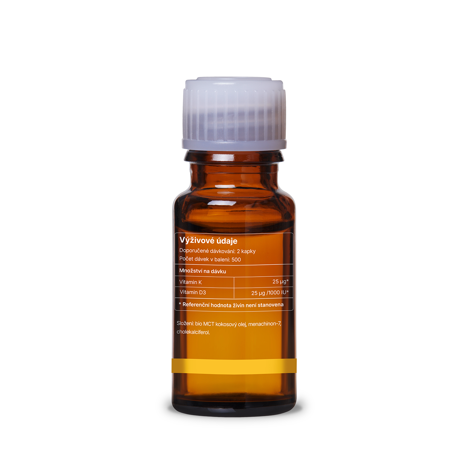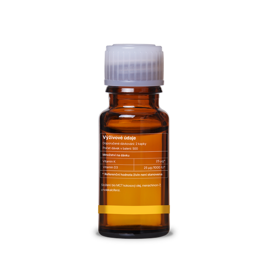 - 2 kapky = 1000 IU (25μg) vitamínu D3 & 25 μg vitamínu K2 MK7