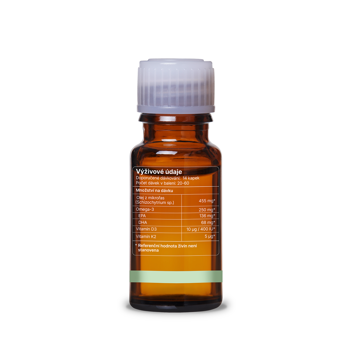 - prémiový olej z mikrořasy (Schizochytrium sp.) bohaté na omega-3