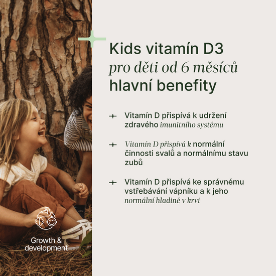 Vitamín D3 čistě rostlinného původu z řas vhodný pro nejmenší děti od 6 měsíců. Vitamín D patří mezi často deficitní nutrienty a jeho dostatek je pro dětské zdraví zásadní. Vitamín D pomáhá budovat zdravé zuby a kosti, předchází rozvoji křivice a udržuje správnou funkci imunitního systému.